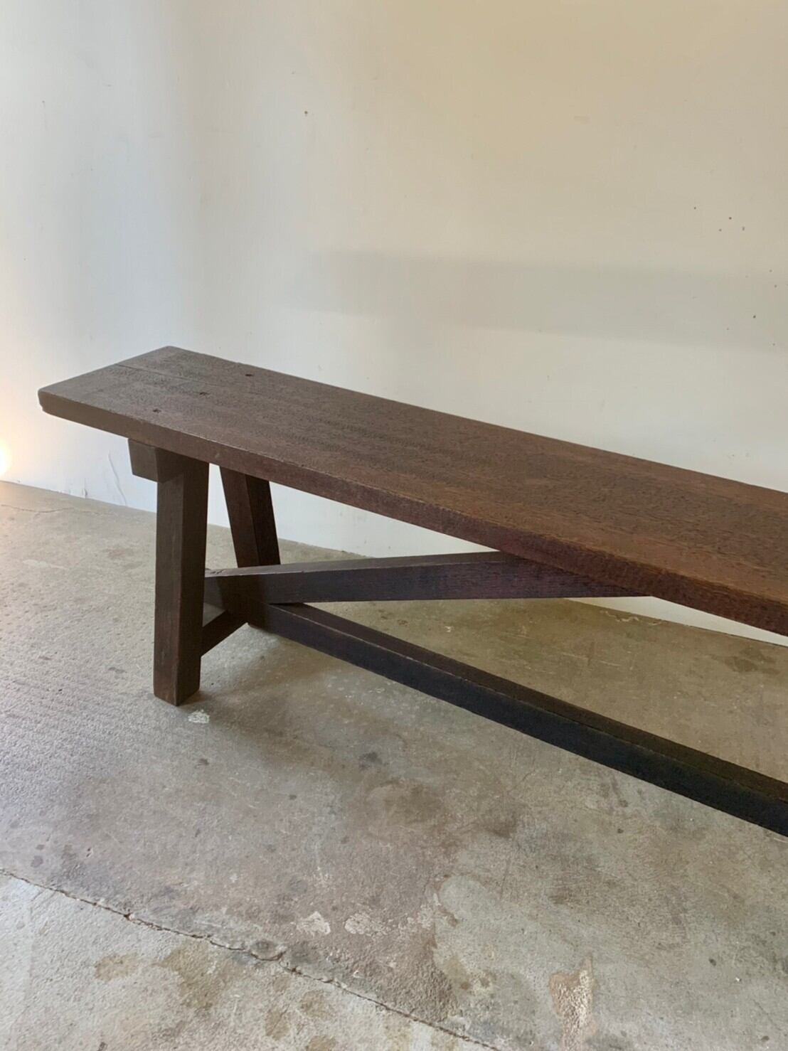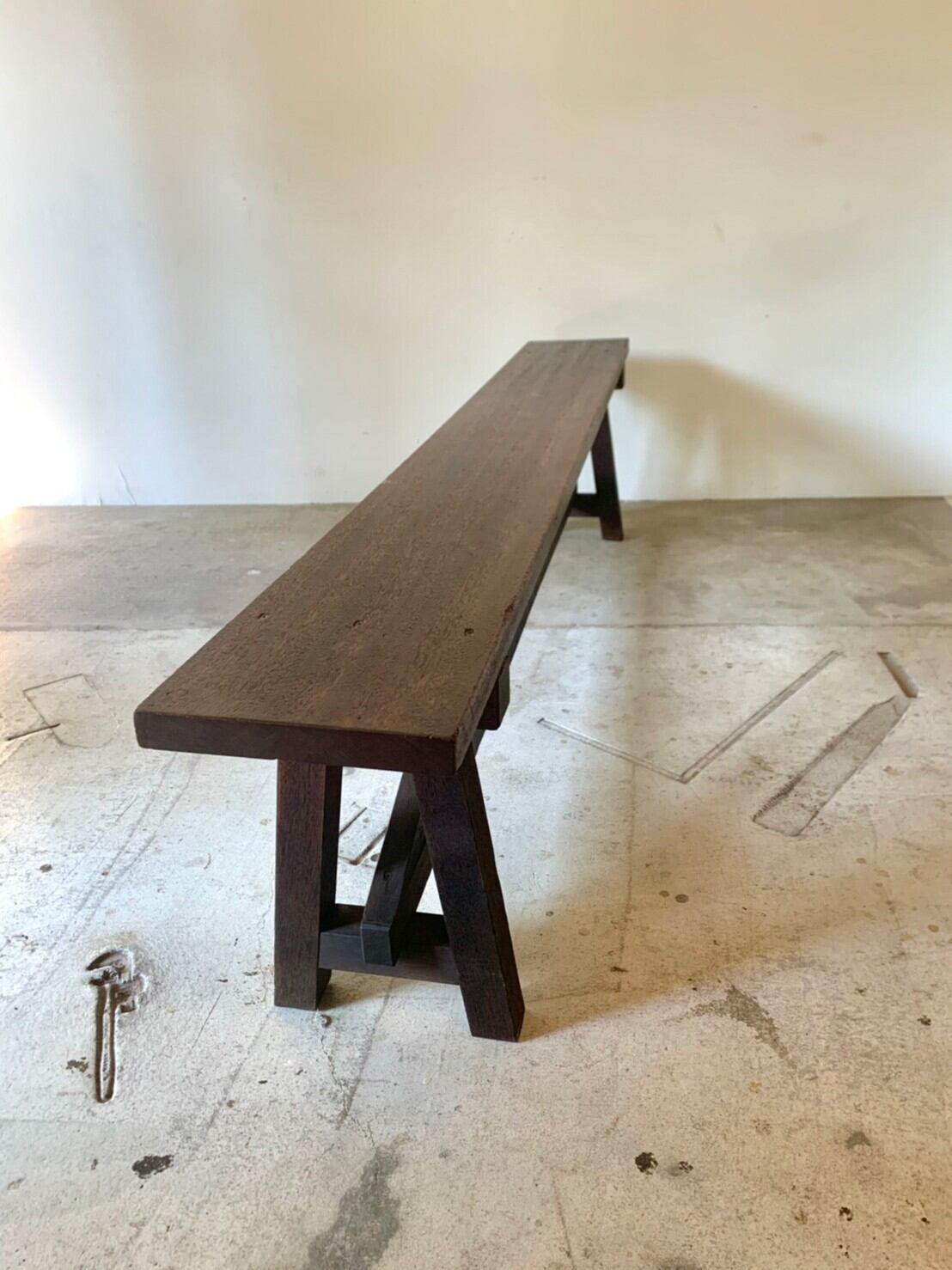 横に長い木のベンチ。